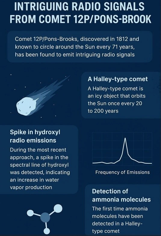 دانشمندان از شناسایی سیگنالهای رادیویی غیرعادی ساطعشده از دنبالهدار ۱۲پی/پونز-بروکس در هنگام نزدیک شدن آن به خورشید، شگفتزده شدند و اعلام کردند که این دادهها میتواند سرنخهای تازهای از منشا آب در زمین ارائه کند.